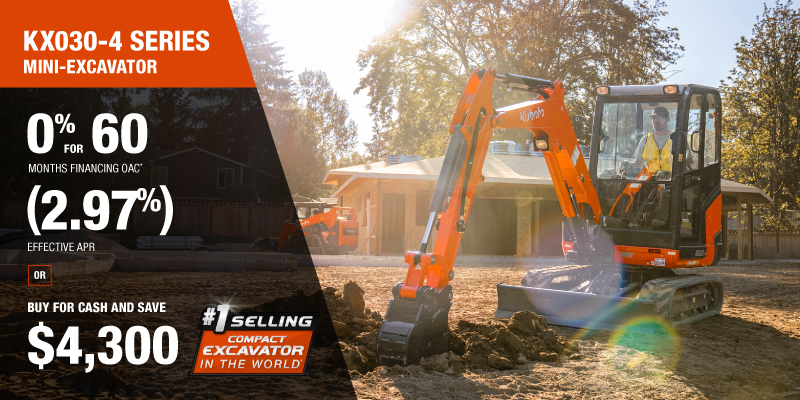 Representative finance example for the KX030-4: $66,597.33 financed at 0% (2.97% effective APR which factors in $4,300.00 in non stackable cash that cannot be combined with finance offers) equals $999.44 monthly for 60 months. $6,662.92 down payment required. Cost of borrowing is $4,300.00 for a total obligation of $66,597.33. Financing available on approved credit. Prices and payments include freight and other applicable fees (including environmental fees, administration fees, set-up fees, and dealer fees on the model specified). Excavator Claim: "Kubota is the world’s #1 selling compact excavator for 20 years." Disclaimer: According to 2023 data from Off-Highway Research including all Kubota Group brand sales. Offer valid until 06-30-2026.